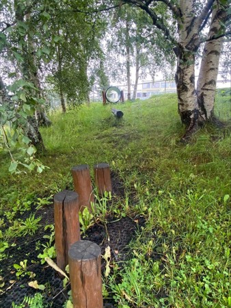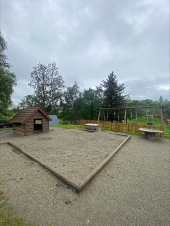 Vi er så heldige å ha et STORT inngjerdet uteområde med både bakker, ulendt terreng, trær/skog, mange lekeapparater for de minste og større barna, bygg og lekehus, frukt- og bærbusker og planter, og mye mye mer. Om vinteren blir uteområde enda større, da vi åpner gjerdet ned til "dalen" for enda større ake- og turområde.